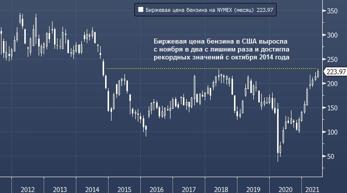 Отметим, что биржевая цена бензина на NYMEX выросла с ноября в два с лишним раза и также достигла рекордных значений с октября 2014 года.