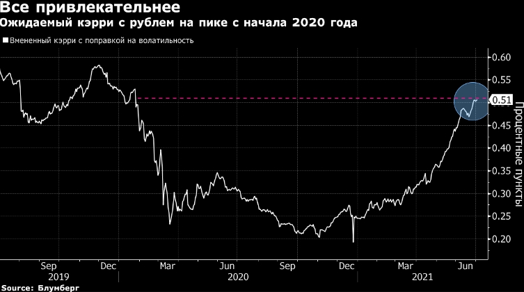 Ожидаемая доходность от кэрри-трейда с рублем увеличилась до пика с января 2020 года после слов председателя Банка России Эльвиры Набиуллиной о том, что регулятор в июле не исключает возможность повышения ключевой ставки сразу на 1%. Участники рынка расценили ее слова как сигналом к ускорению темпов ужесточения денежно-кредитной политики, и теперь трейдеры ждут, что на горизонте трех месяцев стоимость заимствований поднимется до 6,75% с текущих 5,5%.