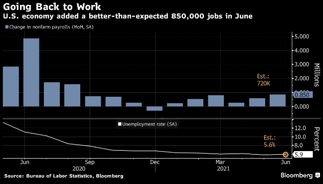 Рост рабочих мест в США ускорился в июне, поскольку компании, отчаявшиеся увеличить производство и услуги на фоне растущего спроса, повысили заработную плату и предложили стимулы, чтобы вернуть миллионы не желающих возвращаться на работу безработных американцев обратно в строй. Число рабочих мест вне сельского хозяйства увеличилось на 850 000 в прошлом месяце после роста на 583 000 в мае, сообщило министерство труда в своем тщательно отслеживаемом отчете о занятости в пятницу. Уровень безработицы вырос до 5,9% с 5,8% в мае.