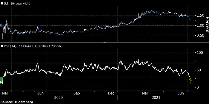 Тем временем снижение доходности 10-летних трежерис ускоряется: дневной RSI, который является индикатором моментума, впервые с марта 2020 года опустился ниже отметки 30.