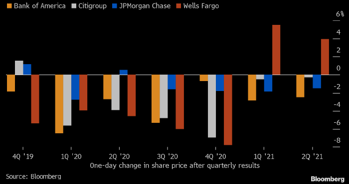 Процентное изменение акций Bank of America, Citigroup, JPMorgan Chase и Wells Fargo в день публикации квартального отчета. Источник: Bloomberg