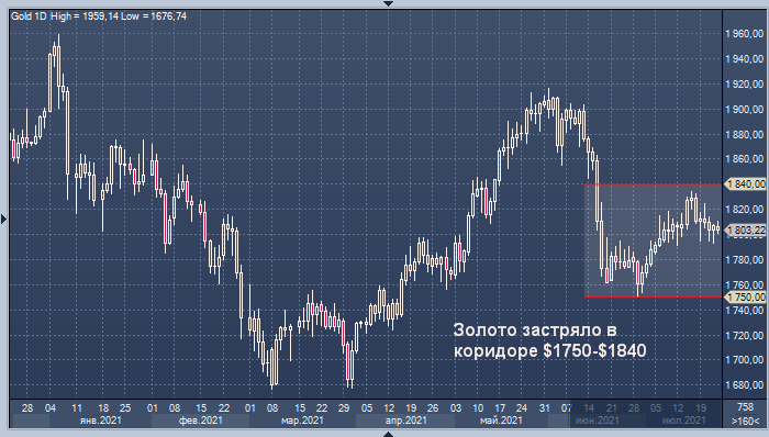 Пока золото застряло в коридоре $1750-$1840, и его дальнейшая динамика вряд ли определится раньше окончания заседания ФРС.