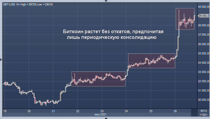 В прошлый вторник цена биткоина впервые за месяц опустилась ниже $30 000, но надолго там не задержалась и уже на следующий день отскочила обратно. Было ли краткосрочное падение ниже важного психологического уровня следствием ликвидации остатков «слабых» спекулятивных длинных позиций или чем-то еще — неизвестно, но с тех пор главная криптовалюта растет без откатов, предпочитая лишь периодические консолидации.