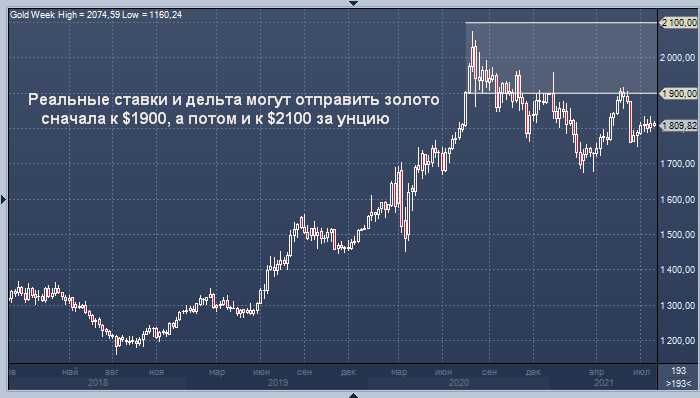 «Это может спровоцировать рост цены золота в область $1900 за унцию уже в ближайшей перспективе», - отмечает эксперт. - «В дальнейшем экономические последствия быстрого распространения варианта дельта, вероятно, заставят мировые центробанки сохранять мягкую позицию, и в среднесрочной перспективе цена золота может превысить $2100».