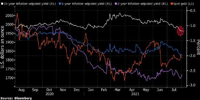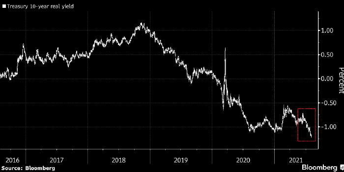 «Подобные уровни реальной доходности трежерис отражают опасения нового охлаждения экономики из-за дельты», - отмечает стратег по долговому рынку Bloomberg Intelligence Айра Джерси. - «Это может побудить ФРС продлить срок проведения программы покупки активов».