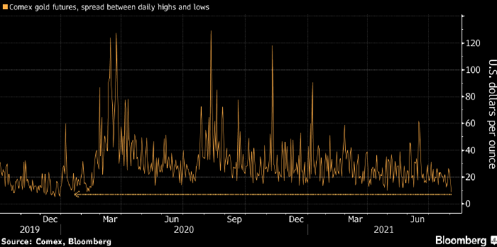 Дневной диапазон между максимумами и минимумами фьючерсов на золото на Comex. Источник: Bloomberg