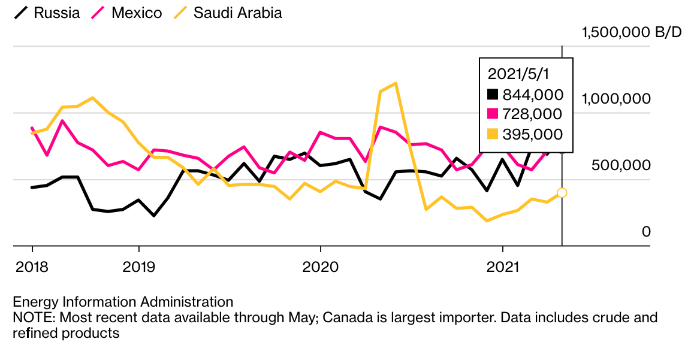 По данным правительства, импорт нефти и нефтепродуктов из России в мае вырос на 23% до 844 000 баррелей в сутки по сравнению с предыдущим месяцем. Мексика лишилась второй позиции, поскольку поставки северному соседу увеличились менее чем на 3%.