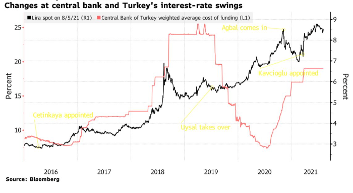 До сих пор глава ЦБ Турции Сахал Кавчиоглу игнорировал призывы президента к более мягкой политике и держал ставки без изменений на уровне 19%. Несмотря на то, что это один из самых высоких показателей в развивающихся странах, инфляция в стране продолжает стремительно расти.