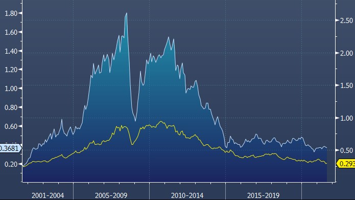 Эти события толкают соотношение между MSCI Emerging Markets Index и S&P 500 к двадцатилетним минимумам, достигнутым после атак 11 сентября 2001 года.