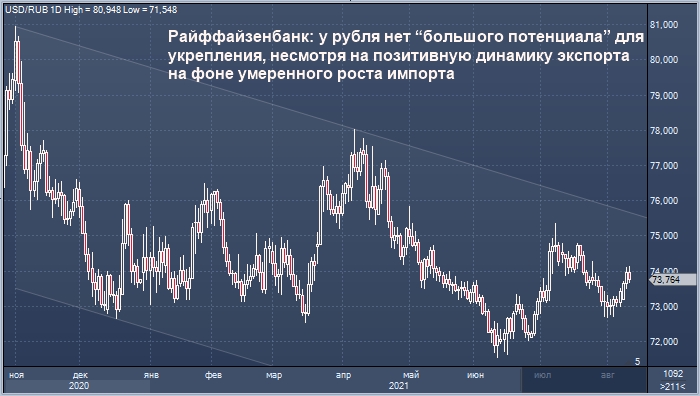 У рубля нет «большого потенциала» для укрепления, несмотря на позитивную динамику экспорта на фоне умеренного роста импорта, говорится в обзоре Райффайзенбанка.