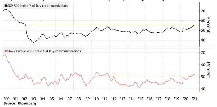 Спросом пользуются не только акции американских компаний. В Европе на долю рекомендаций «покупать» по акциям Stoxx 600 приходится около 52% — это 10-летний максимум. В Азии это число достигает 75% — самый высокий показатель как минимум с 2010 года.