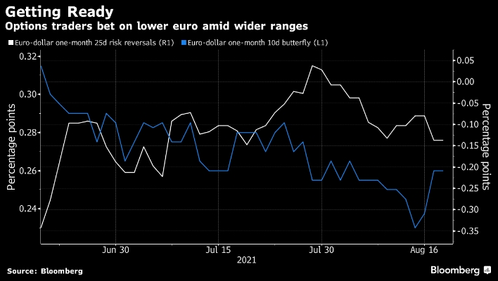 Недельный разворот риска, показатель рыночного позиционирования и настроений, торгуется на уровне 13 базисных пунктов в пользу путов по евро против паритета в понедельник.