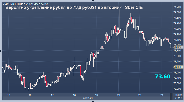Аналитики Sber CIB ждут рост курса рубля по отношению к доллару до уровня 73,6 руб./$1 во вторник.