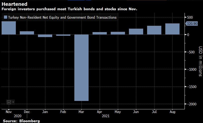 Рост лиры также воодушевил турецких фондовых инвесторов, в результате чего индекс Borsa Istanbul 100 Index вырос на 3,8% в августе и положил путь к лучшему месячному росту в этом году. Иностранные инвесторы осуществили чистые покупки на $ 321 млн турецких акций и облигаций в этом месяце по состоянию на 20 августа (см. график ниже), что уже является самым большим притоком за девять месяцев, несмотря на колебания аппетита к риску на фоне опасений по поводу распространения заразного вируса и сокращения количественного смягчения ФРС.