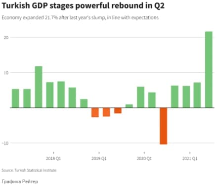 Экономика Турции выросла на 21,7% в годовом исчислении во втором квартале, как и ожидалось, как показали официальные данные в среду, после резкого спада годом ранее, вызванного ограничениями COVID-19.