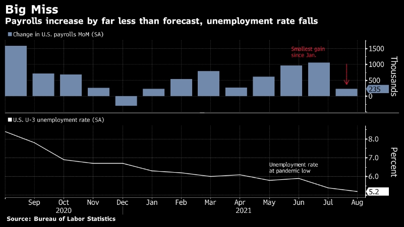 Доллар упал до самого низкого уровня почти за месяц после данных, которые показали, что работодатели США добавили всего 235 000 рабочих мест в августе, что значительно ниже среднего прогноза в опрос Блумберг в 733 000. Индекс доллара США Bloomberg упал на 0,3%. EUR / USD поднялся на 0,3% до 1,1908, самого высокого уровня с 30 июля, против 1,1871 перед релизом. USD / JPY падает до нового сессионного минимума 109,63; пара была 109,93 перед данными.