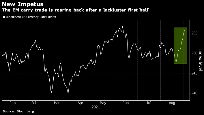 В то время как в первом полугодии кэрри-трейд на развивающихся рынках вернул всего 0,5%, индекс кэрри-трейдинга Bloomberg на развивающихся рынках уже вырос почти на 2% с конца июля, при этом лидируют высокодоходные, но волатильные валюты, такие как турецкая лира и южноафриканский ранд. Индекс валют развивающихся рынков MSCI рос 9 из последних 11 сессий.