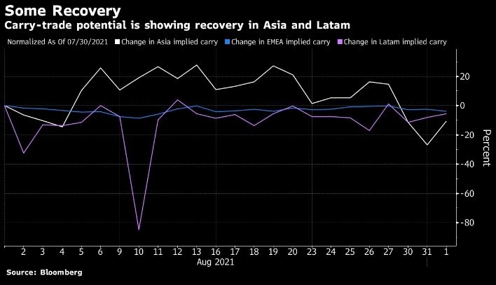 Предполагаемая доходность рубля с поправкой на волатильность, например, выросла более чем на 200 базисных пунктов до 20-месячного максимума после повышения ставки в июле, и еще одно ожидается на этой неделе. И хотя в прошлом месяце предполагаемая доходность в регионах с формирующимся рынком снизилась, в Азии и Латинской Америке уже наблюдается некоторое восстановление.