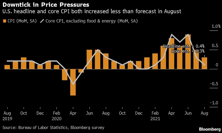 Базовые потребительские цены в США в августе росли самыми медленными темпами за шесть месяцев, что свидетельствует о том, что инфляция, вероятно, достигла пика, хотя некоторое время может оставаться высокой на фоне постоянных ограничений предложения. Министерство труда сообщило во вторник, что его индекс потребительских цен без учета нестабильных продуктов питания и энергоносителей вырос на 0,1% в прошлом месяце. Это был наименьший прирост с февраля, после роста на 0,3% в июле.