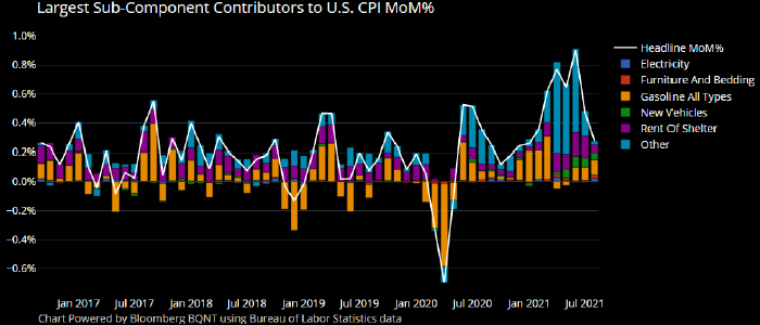 Потребительская инфляция в США устойчиво росла с октября, однако вчерашние данные за август порадовали сторонников точки зрения ФРС о том, что в конечном итоге быстрый рост цен окажется временным явлением. Министерство труда США сообщило, что в прошлом месяце потребительские цены в стране выросли на 0,3% м/м против прогноза на уровне +0,4%, а базовая инфляция и вовсе замедлилась до +0,1% м/м против прогноза на уровне +0,3% м/м.