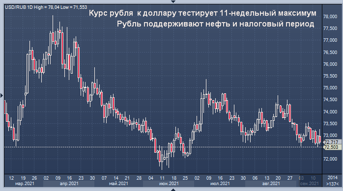 Российская валюта подскочила до 11-недельного максимума по отношению к доллару на предыдущей сессии после того, как данные показали более слабый, чем ожидалось, рост инфляции в США в прошлом месяце. В дальнейшем рубль вернулся к отметке 73. А сегодня он смог укрепиться на нефть. Инвесторы теперь ждут заседания Федеральной резервной системы 21-22 сентября.