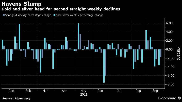 График Bloomberg Массивные меры стимулирования в эпоху пандемии со стороны крупных центральных банков поддержали цены на золото и серебро, но за последние несколько месяцев эти защитные активы упали, поскольку возникли ожидания их сокращения. Заседание Федеральной резервной системы 21-22 сентября может дать ключ к пониманию графика сокращения покупок облигаций, что имеет решающее значение для прогнозов по золоту.