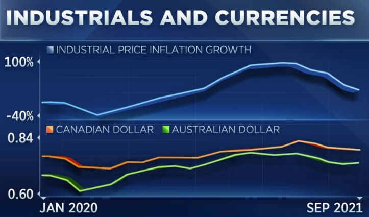 По его словам, канадский и австралийский доллар, обе товарные валюты, тесно связаны с инфляцией цен на сырьевые товары, и тот факт, что они начали дешеветь, подтверждает снижение инфляции промышленных цен. Канадский доллар тесно связан с ценами на нефть , тогда как австралийский доллар имеет высокую корреляцию с нефтью и золотом.