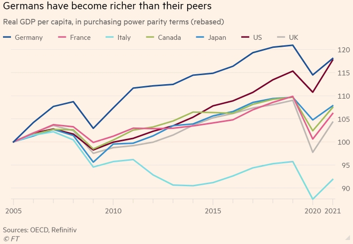 С 2005 года валовой внутренний продукт Германии на душу населения рос в два раза быстрее, чем в Великобритании, Канаде, Японии или Франции.