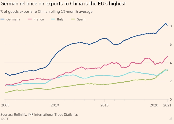 Кроме того, производство в Германии, на которое сейчас приходится 40% всей продукции еврозоны, поддержало рост Китая. Сегодня зависимость Германии от Китая как экспортного рынка исключительно высока в еврозоне.