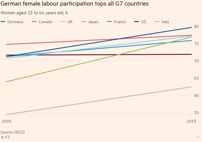 Однако это не относится к качеству занятости. Большая доля работников остается на низкооплачиваемых работах, и за последние два десятилетия не произошло качественного улучшения. Многие женские рабочие места также остаются с неполным рабочим днем, и только в одной компании, входящей в индекс голубых фишек Германии Dax, исполнительным директором является женщина.