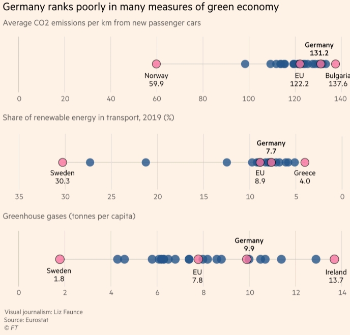 Ее выбросы парниковых газов на душу населения выше средних показателей по ЕС, здесь меньше энергии из возобновляемых источников, а также выше выбросы CO2 от новых легковых автомобилей.