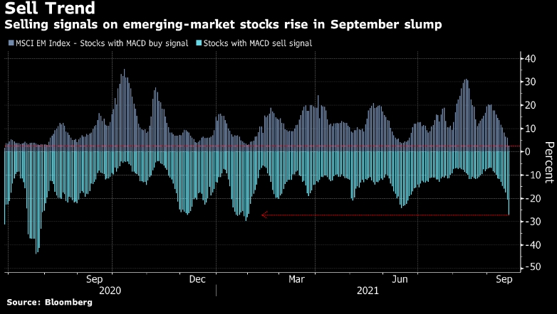Тем не менее, количество акций в MSCI Emerging Markets Index с сигналом продажи, основанным на модели конвергенции-расхождения скользящих средних, подскочило до уровней, которые последний раз наблюдались в январе.