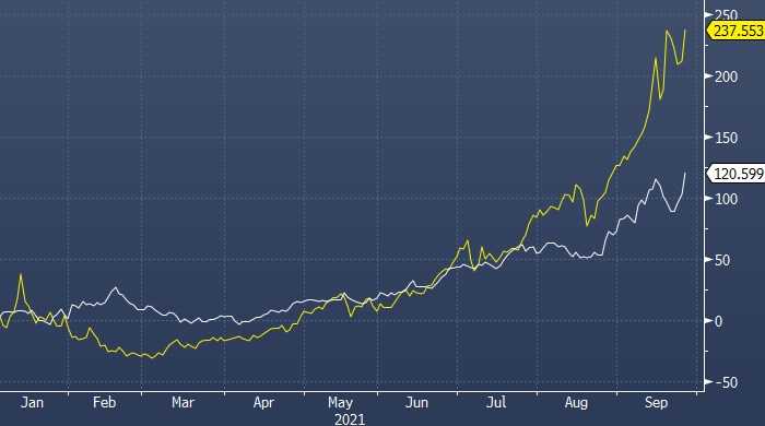 Процентная динамика биржевых цен на природный газ в США (белым) и в Великобритании (желтым) с начала года