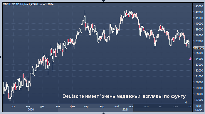 Deutsche Bank имеет «очень медвежий» взгляд по фунт, учитывая перспективу резкого сокращения бюджетного стимулирования в Великобритании, последствия выхода из ЕС и прекращение программы сохранения рабочих мест, говорят стратеги, в том числе Джордж Саравелос, а также Шрейас Гопал. Банк видит риск того, что Банк Англии не оправдает ожиданий в вопросе скорейшей нормализации ДКП.