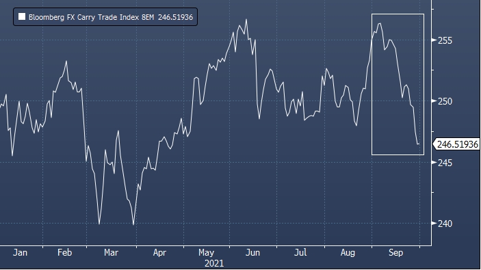 Индекс, который отражает отдачу от заимствований в долларах и инвестиций в восемь таких высокодоходных валют, как турецкая лира, бразильский реал и индонезийская рупия, просел на 3,3% в сентябре, или на максимальную величину с марта 2020 года. В итоге с начала года индекс Bloomberg Cumulative FX Carry Trade упал на 1,2%.