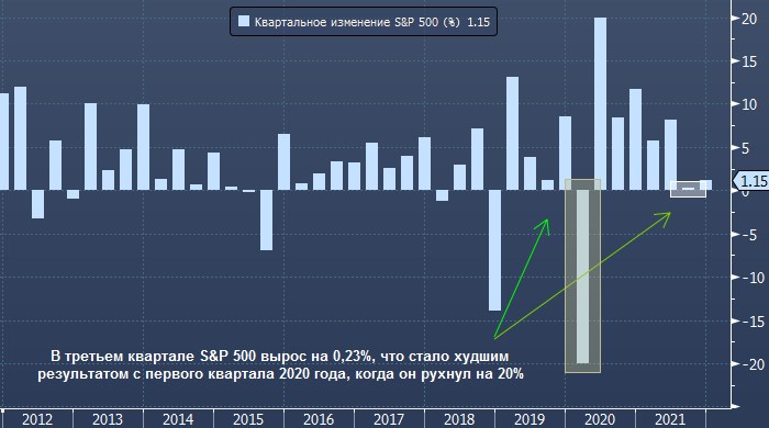 2 сентября S&P 500 достиг последнего на данный момент исторического максимума на уровне 4545 пунктов, однако по итогам месяца снизился на 4,76% и, таким образом, прервал семимесячный рост. В последний раз индекс показывал месячное снижение в январе, и тогда оно составило 1,11%. По итогам третьего квартала S&P 500 вырос на 0,23%, что стало наихудшим результатом с первого квартала 2020 года, когда он снизился на 20%.