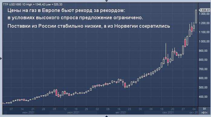 Между тем, текущее газовое ралли причиняет много головной боли чиновникам ЕС. Позднее в октябре лидеры Евросоюза обсудят идею создания стратегического резерва газа в ЕС и отделения цен на электроэнергию от цен на газ, заявила во вторник глава Европейской комиссии Урсула фон дер Ляйен. Выступая перед журналистами в Эстонии, фон дер Ляйен сказал, что рост цен на электроэнергию для европейских потребителей был в основном результатом удорожания газа, поскольку мировой спрос увеличился, но ключевые европейские поставщики газа, такие как Россия, не увеличили предложение.