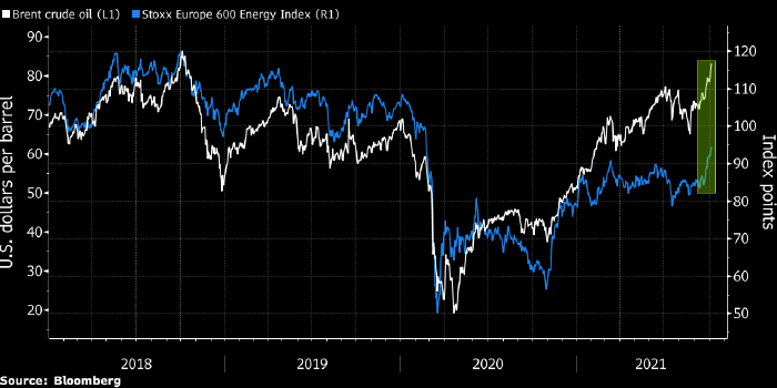 Акции европейских энергетических компаний в последнее время также заметно подорожали и начали сокращать разрыв с ценами не нефть, который начал расти в конце прошлого года. В сентябре энергетический индекс европейского фондового индикатора Euro Stoxx 600 вырос на 11%, что стало наилучшим результатом среди всех его секторов. Несмотря на это, сравнительный анализ динамики цен на нефть и индекса энергетических компаний Euro Stoxx 600 говорит о том, что сегодня они стоят примерно $65 за баррель Brent, тогда как сама смесь европейских энергетиков сегодня торгуется чуть ниже $82 за баррель (см. график ниже — прим. ProFinance.ru).