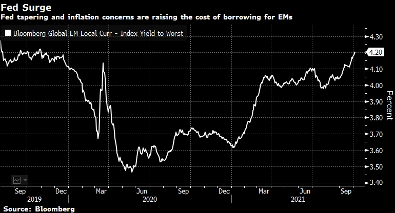 Южная Корея в 2022 году рассчитывает выпустить наименьшее количество облигаций за два года, а Польша в прошлом месяце заявила, что не будут продавать ноты на открытых аукционах в четвертом квартале. Центробанк последней в среду неожиданно повысил процентные ставки в первый раз с 2012 года после аналогичный решения в Румынии днем ранее. Индонезия планирует сократить как государственные расходы, так и государственные займы в следующем году.