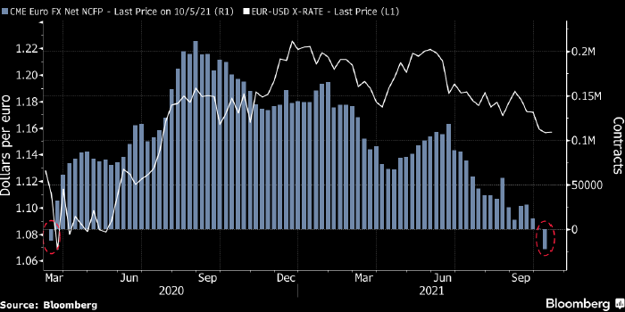 Впервые с марта 2020 года спекулянты ставят на снижение евро против доллара. Усиление бычьих настроений по американской валюте было обусловлено ростом доходности гособлигаций США, который, в свою очередь, стал следствием ястребиной риторики ФРС, озвученной на заседании 22 сентября. С 22 сентября по 5 октября индекс доллара DXY укрепился на 0,85%, а доходность 10-летних трежерис выросла c 1,30% до 1,525%. Рост доходности гособлигаций США сопровождается расширением спреда к гособлигациям других развитых стран, включая Германию. Все это выглядит весьма логичным, учитывая довольно жесткую позицию ФРС и мягкую позицию ЕЦБ. За последний месяц курс евро к доллару снизился примерно на 2%.