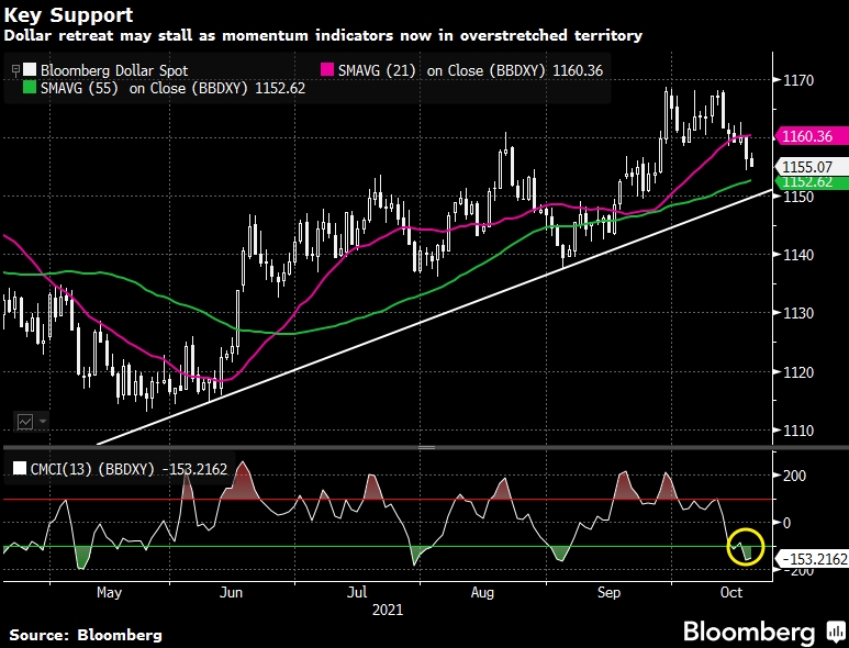 Индекс доллара Bloomberg упал более чем на 1% с момента достижения своего циклического максимума, поскольку отскок казначейских облигаций на прошлой неделе побудил инвесторов зафиксировать прибыль по длинным позициям. Краткосрочная коррекция изменила положение индикаторов по доллару, особенно импульса (моментума), и теперь они показывают, что позиционирование больше не вызывает беспокойства у тех, кто покупает валюту.