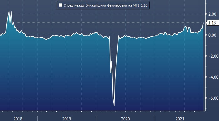 Динамика запасов в Кушинге, который является местом осуществления поставки по фьючерсам на WTI, сильно влияет на структуру кривой этих инструментов. В настоящий момент бэквордация* в ближайших фьючерсах на нефть WTI достигла рекордного значения за три с лишним года, что указывает на дефицит черного золота и предрекает дальнейшее снижение запасов в Кушинге.