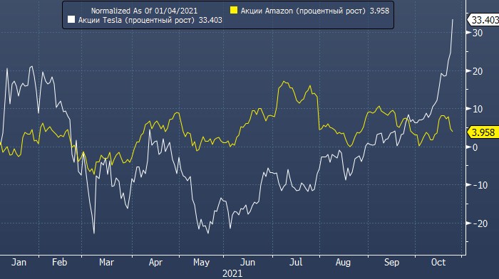 Процентный рост акций Tesla (белым) и Amazon (желтым) с начала 2021 года