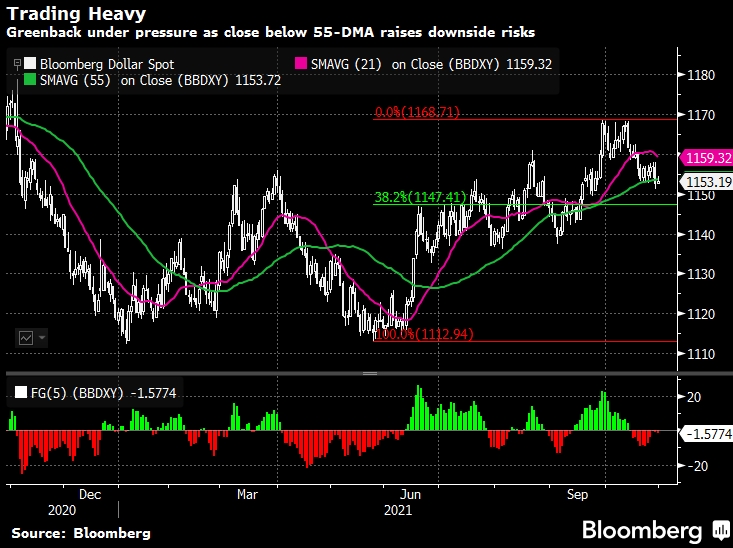 Индекс доллара Bloomberg (BBDXY) Поддержка со стороны 55-дневного скользящего среднего значения (DMA) пробита, поскольку индекс вчера закрылся ниже данного индикатора впервые с середины сентября; 21-DMA поворачивает на юг, и у этой коррекции, похоже, есть ноги с ключевой поддержкой Фибоначчи, находящейся примерно на 0,6% ниже спотовых цен.
