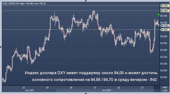 Индекс доллара DXY имеет поддержку около 94,00 и может достичь основного сопротивления на 94,55 / 94,70 в среду вечером, сообщает ING. Последний раз DXY вырос на 0,1% до 94,1970, достигнув максимума за две с половиной недели 94,3090.