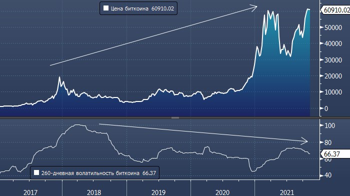Естественное взросление отрасли привлекает на рынок цифровых валют все большее число институциональных инвесторов, а в октябре появился первый ориентированный на биткоин биржевой фонд (BITO ETF). Эти события повышают ликвидность рынка, которая, в свою очередь, ведет к снижению волатильности.