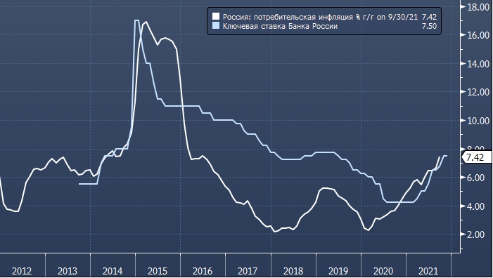 На графике отображения динамика потребительской инфляции в РФ и ключевой ставки ЦБ РФ.