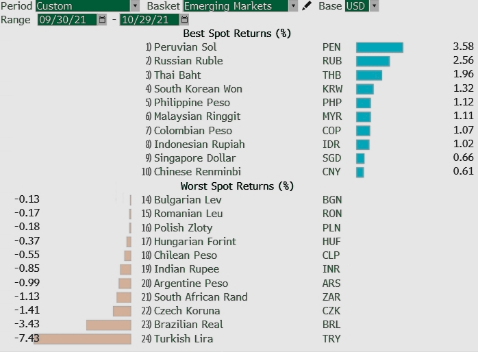 Bloomberg: лидеры роста и падения среди валют развивающихся рынков в октябре 2021 г.