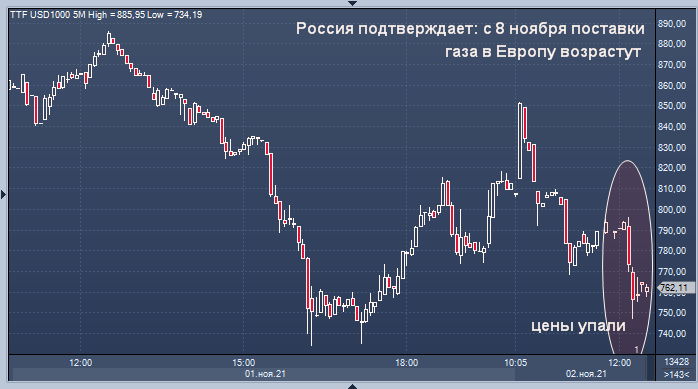 Цены на газ в Европе упали на $100 до $750 после комментариев пресс-секретаря президента России Дмитрия Пескова, который подтвердил обещание Владимира Путина нарастить поставки газа в Европу после 8 ноября.