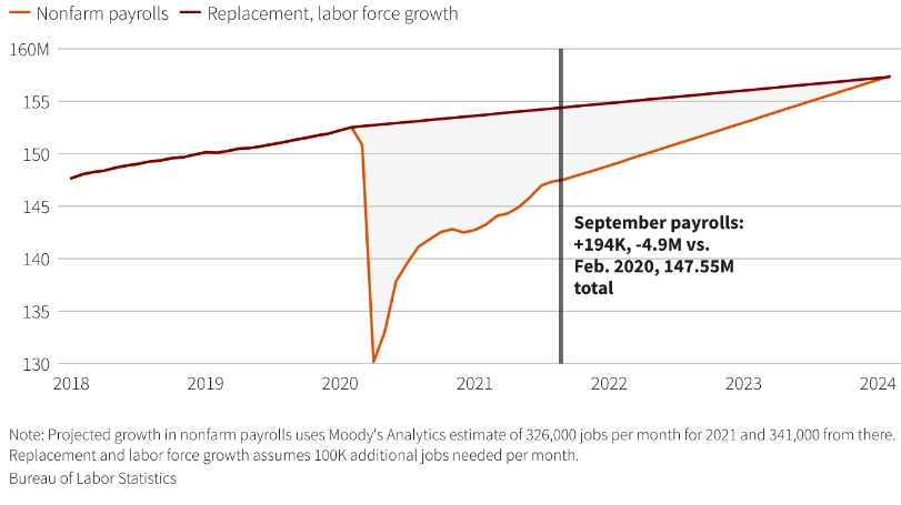 Представители ФРС по-прежнему в основном придерживаются этой точки зрения. К 2022 году они ожидают, что глобальные узкие места в предложении ослабнут, а вызванный пандемией спрос на товары среди потребителей в США снизится после массовых расходов на автомобили, мотоциклы и бытовую технику, и достаточное количество людей будут стремиться вернуться на рабочие места.